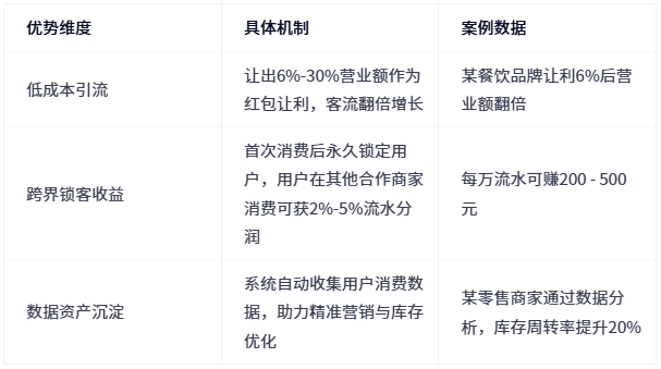 间接分润:间接粉丝全国消费流水可获万分之20-100分润(如50家店锁客10万人,年分润可达200万元)。